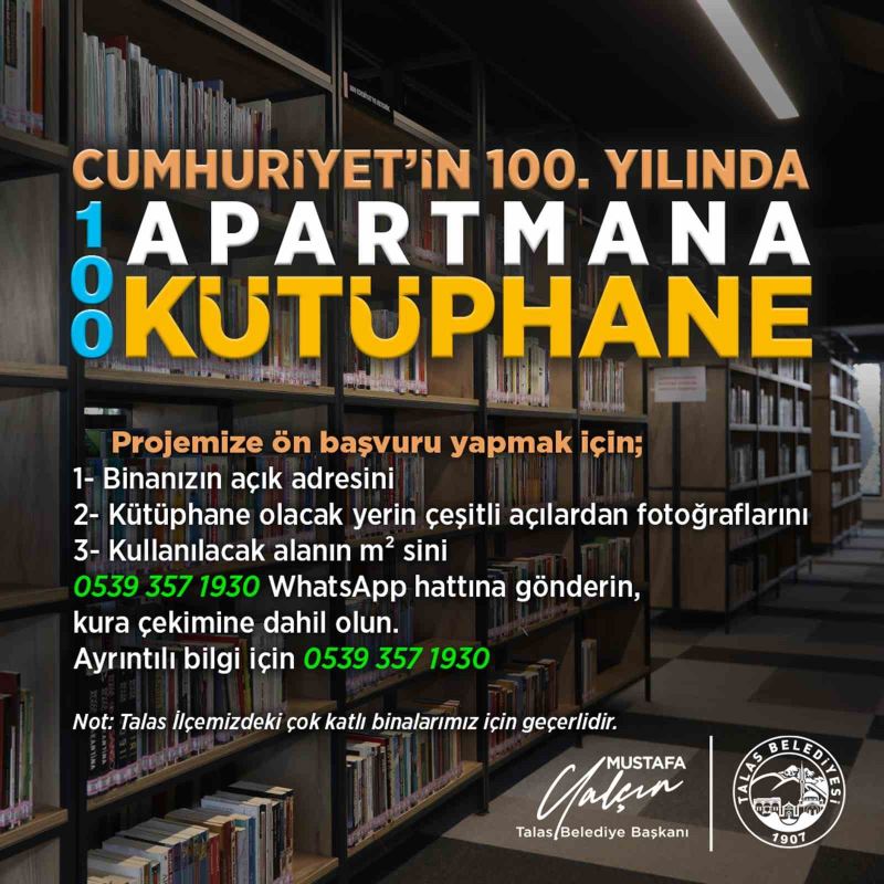 TALAS BELEDİYE BAŞKANI MUSTAFA YALÇIN’IN CUMHURİYETİN 100. YILINA ARMAĞAN OLARAK DUYURDUĞU 100 APARTMANA 100 KÜTÜPHANE İÇİN BAŞVURULAR DEVAM EDİYOR.
