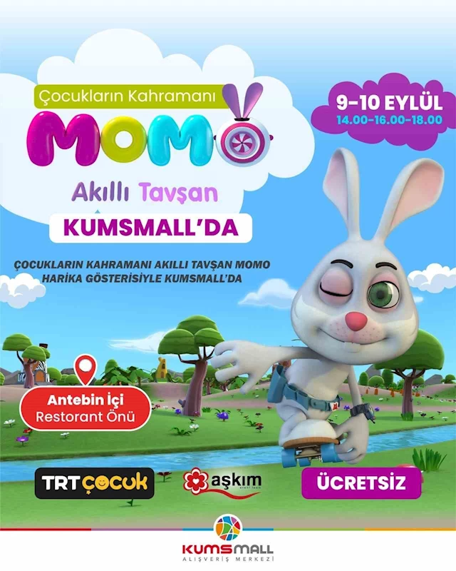 Bu yaz, TRT Çocuk’un hemen hemen tüm çizgi film kahramanlarını çocuklarla buluşturan KumsMall AVM, bu hafta yeni bir kahramanı Kayseri’ye getiriyor. Avrupa’nın en büyük karma AVM’si olan KumsMall, çocuklara yönelik etkinliklerine Akıllı Tavşan Momo ile devam edecek.