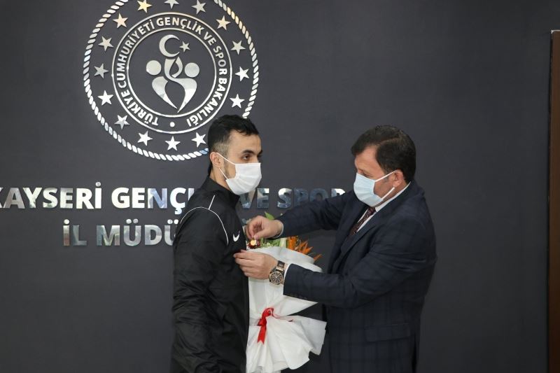 Şampiyonanın ikinci gününde 55 kiloda mücadele ederek koparmada 112 kg ile Büyükler Avrupa ikincisi olan, Kayseri’yi ve ülkemizi gururlandıran Muammer Şahin, Rusya dönüşünde İl Müdürü Ali İhsan Kabakcı’yı makamında ziyaret ederek sevincini paylaştı.