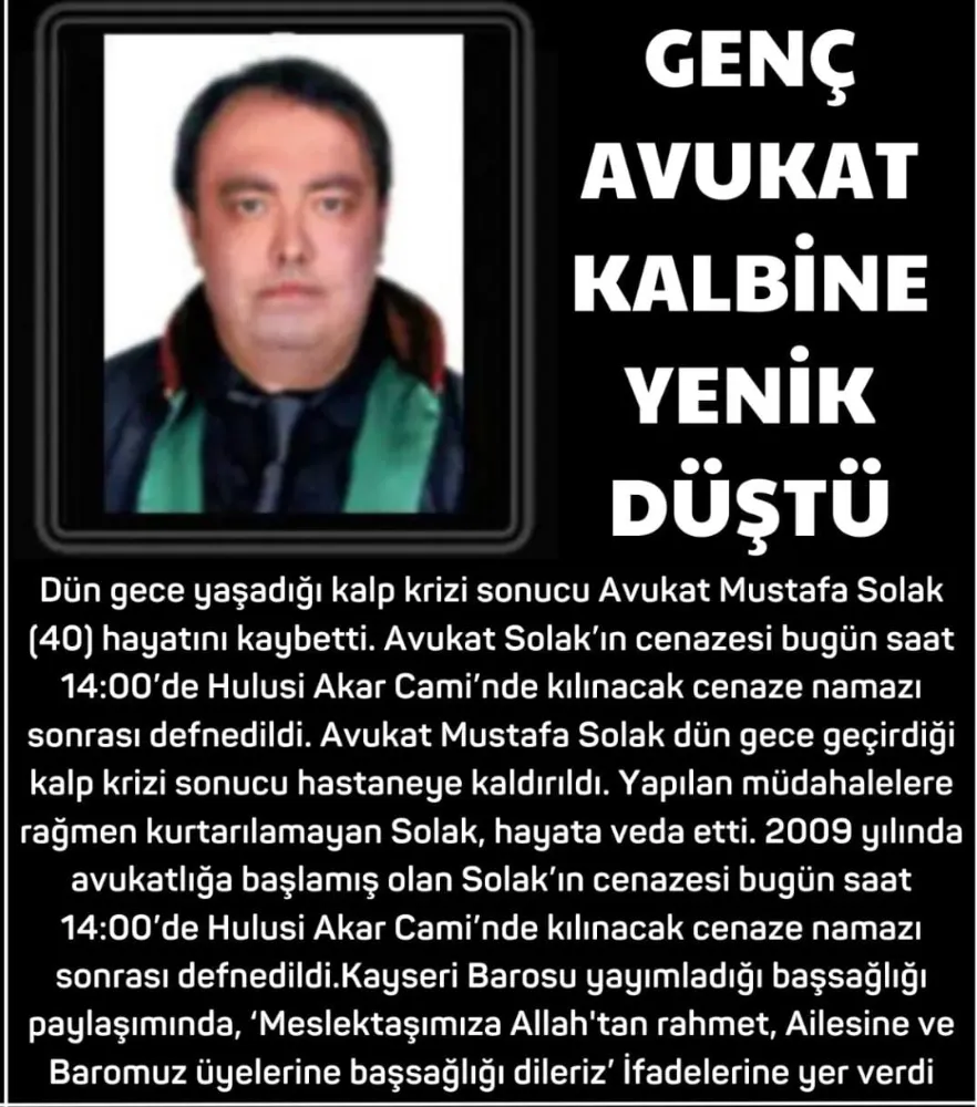 Kayseri’de 2 Temmuz 2009 yılında avukatlık mesleğine başlayan Mutafa Solak, 14 yıldır mesleğini yürütüyordu. Vefat eden Mustafa Solak için Kayseri Barosu baş sağlığı mesajı yayımladı. Mesajda; "02.07.2009 tarihinde avukatlık mesleğine başlayan, kıymetli meslektaşımız Avukat Mustafa Solak, vefat etmiştir. Cenazesi Asri mezarlıkta toprağa verilmiştir. Meslektaşımıza Allah’tan rahmet, ailesine ve Baromuz üyelerine başsağlığı dileriz."