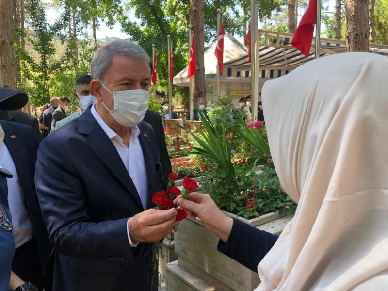 Bayramlaşma ve konuşmaların ardından şehitlik ziyaretine geçen protokole Milli Savunma Bakanı Hulusi Akar da eşlik etti. Bakan Akar ve protokol önce Kartal Şehitliği’ni daha sonra da Polis Şehitliğini ziyaret etti. Şehitlik ziyaretlerinde Bakan Akar, şehit ailelerine karanfil vererek, sohbet etti.
