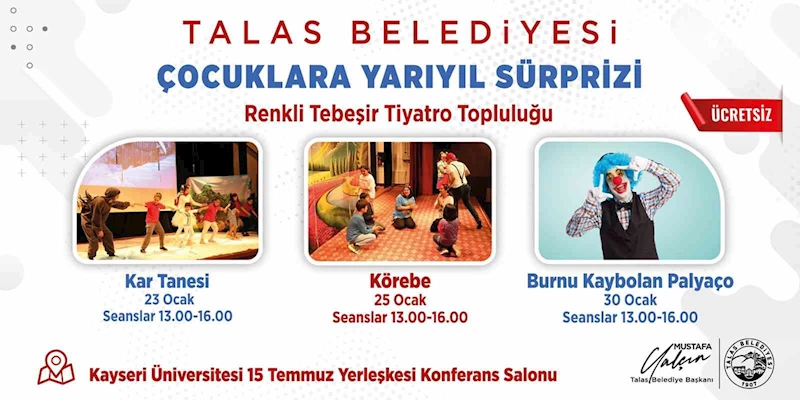 Yarıyıl tatili boyunca devam edecek etkinliklerde “Renkli Tebeşir Tiyatro Topluluğu” tarafından hazırlanan tiyatro gösterileriyle çocuklara unutulmaz bir tatil anısı sunulacak. Kayseri Üniversitesi 15 Temmuz Yerleşkesi Konferans Salonu’nda gerçekleşecek organizasyonda ilk olarak 23 Ocak Salı Günü “Kar Tanesi” isimli çocuk tiyatrosu sergilenecek. Daha sonra 25 Ocak Perşembe Günü ise “Körebe” isimli tiyatro oyunu çocuklarla buluşacak. Ara tatilin son etkinliği ise 30 Ocak Salı Günü gerçekleşecek olan “Burnu Kaybolan Palyaço” isimli çocuk gösterisi olacak. 2 seans halinde gerçekleşecek etkinliklerin ilk seansı saat 13.00’te ikinci seansı ise 16.00’da başlayacak.