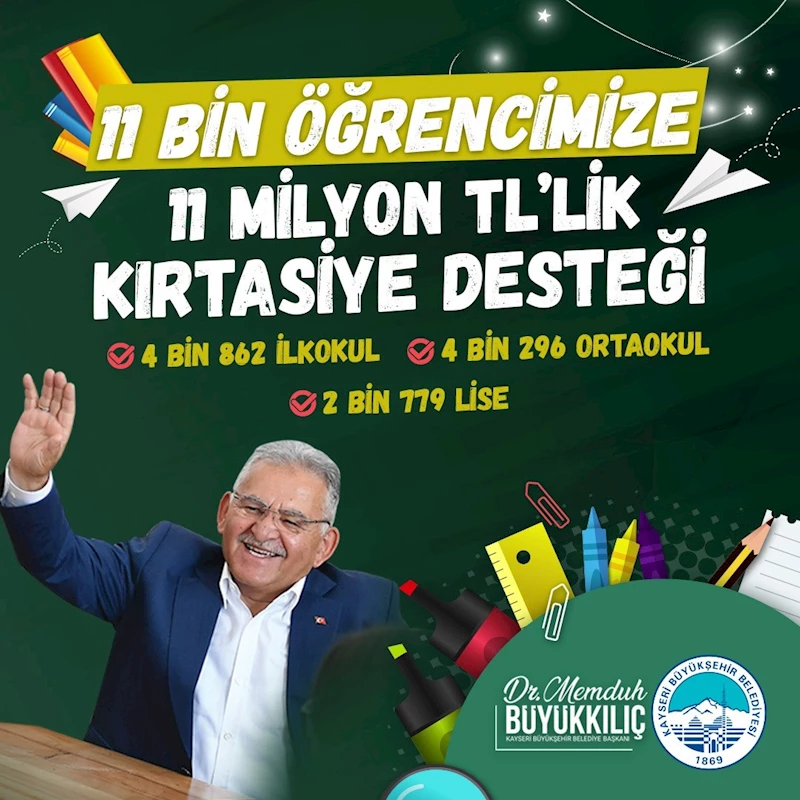 KAYSERİ BÜYÜKŞEHİR BELEDİYE BAŞKANI DR. MEMDUH BÜYÜKKILIÇ’IN, İHTİYAÇ SAHİBİ İLKOKUL, ORTAOKUL VE LİSE ÖĞRENCİLERİNE KIRTASİYE YARDIMLARI İÇİN VERDİĞİ TALİMAT SONRASI, BÜYÜKŞEHİR BELEDİYESİ, 2024-2025 EĞİTİM ÖĞRETİM YILI İÇİN 11 BİN 937 ÖĞRENCİYE 11 MİLY