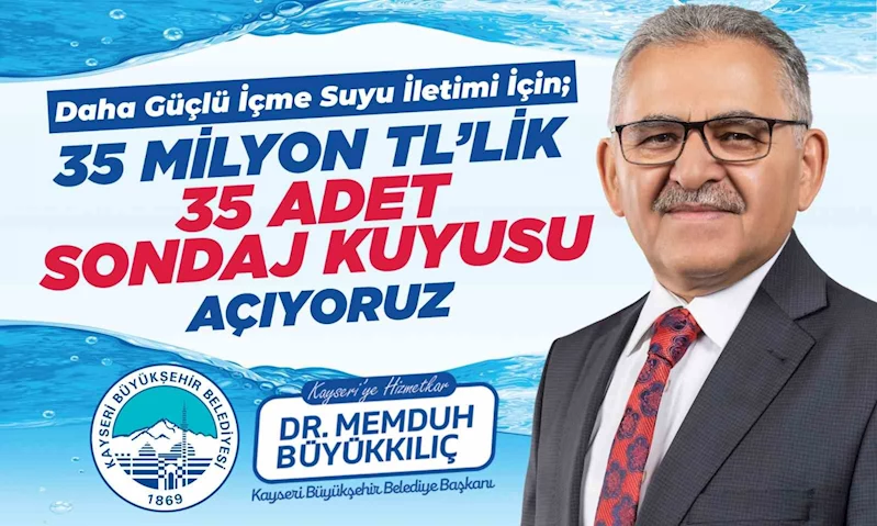 KAYSERİ BÜYÜKŞEHİR BELEDİYE BAŞKANI DR. MEMDUH BÜYÜKKILIÇ, KENT GENELİNDE İÇME SUYU İLETİMİNİ GÜÇLENDİRMEK İÇİN PLANLANAN VE TOPLAM MALİYETİ 35 MİLYON TL OLAN 35 ADET SONDAJ KUYUSU AÇILACAĞINI İFADE ETTİ.