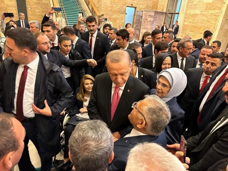 Cumhurbaşkanı Recep Tayyip Erdoğan ile Türkiye Büyük Millet Meclisi (TBMM) Genel Kurulu’nda yemin töreni öncesi görüşen Başkan Büyükkılıç, Cumhurbaşkanı Erdoğan’a Kayserililerin selamlarını iletti. Başkan Büyükklıç, Cumhurbaşkanlığı Külliyesi’ndeki “Göreve Başlama Töreni’ne de katıldı. Büyükkılıç, 21 devlet başkanı, 13 başbakanın da katıldığı toplantı ile ilgili yaptığı açıklamada, “Aziz Türk milletinin iradesiyle yeniden Cumhurbaşkanı seçilen Recep Tayyip Erdoğan ile bir araya gelerek, siz değerli hemşehrilerimizin selam ve sevgilerini ilettik. Türkiye Yüzyılı başlıyor. Son 21 yılda olduğu gibi bütün gücümüzle hizmet etmeye devam edeceğiz” diye konuştu. Kayseri Büyükşehir Belediye Başkanı Dr. Memduh Büyükkılıç, Ankara temasları çerçevesinde Türkiye Büyük Millet Meclisi’ne de misafir olarak, burada Cumhurbaşkanı Erdoğan’ın yemin törenine şahitlik etti. Bakan localarının olduğu alanda yemin törenini takip eden Başkan Büyükkılıç, bakanlarla birlikte sıcak ve samimi sohbet gerçekleştirerek, yeni dönem parlamentosunu ilgiyle takip etti. Türkiye Cumhuriyeti Cumhurbaşkanı Recep Tayyip Erdoğan mecliste, mazbatasını TBMM Geçici Başkanı Devlet Bahçeli’den alarak, yemin edip, görevine başladı. O anlara şahitlik eden Başkan Büyükkılıç, “Cumhurbaşkanımız Recep Tayyip Erdoğan’ın Gazi Meclisimizdeki yemin törenine şahitlik etmenin onur ve mutluluğunu yaşadık” ifadelerini kullandı. Büyükkılıç, yeni dönemin ülkeye ve millete hayırlı olmasını temenni etti.