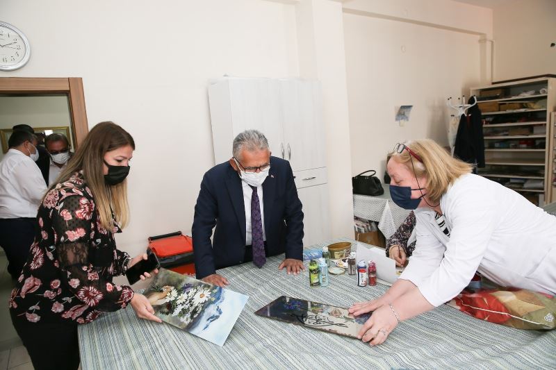 Başkan Büyükkılıç, tesislerdeki bölümleri tek tek ziyaret edip, el emeği göz nuru eserleri ilgiyle izleyerek, kursiyerlerle de sohbet etti.