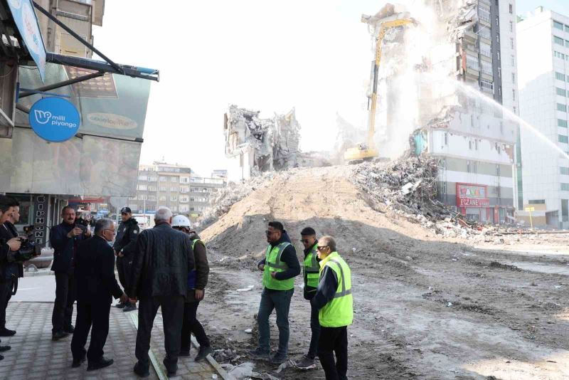 Ağır hasarlı binadaki yıkım çalışmalarını inceledi