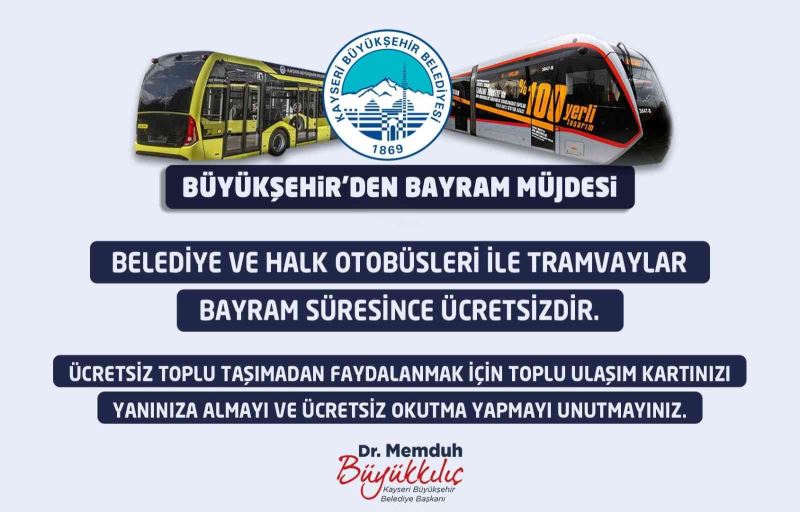 Kayseri Büyükşehir Belediye Başkanı Dr. Memduh Büyükkılıç, Ramazan Bayramı boyunca kent içi toplu taşımanın ücretsiz olacağını duyurdu. Başkan Büyükkılıç, sadece belediye otobüsleri ve tramvayları değil özel halk otobüslerini de ücretsiz yaptıklarını belirterek, vatandaşların bayram boyunca toplu ulaşım kartlarını kullanarak ulaşımdan ücretsiz şekilde faydalanabileceğini söyledi.