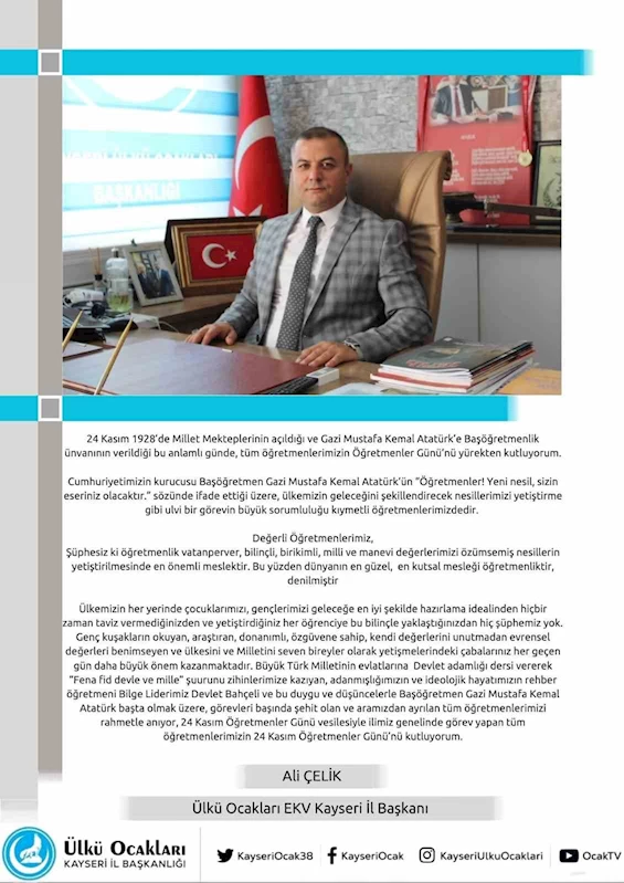 Ülkü Ocakları Eğitim ve Kültür Vakfı Kayseri İl Başkanı Ali Çelik, 24 Kasım Öğretmenler Günü dolayısıyla yayımladığı mesajında, “Ülkemizin geleceğini şekillendirecek görevin büyük sorumluluğu öğretmenlerimizdedir” dedi.