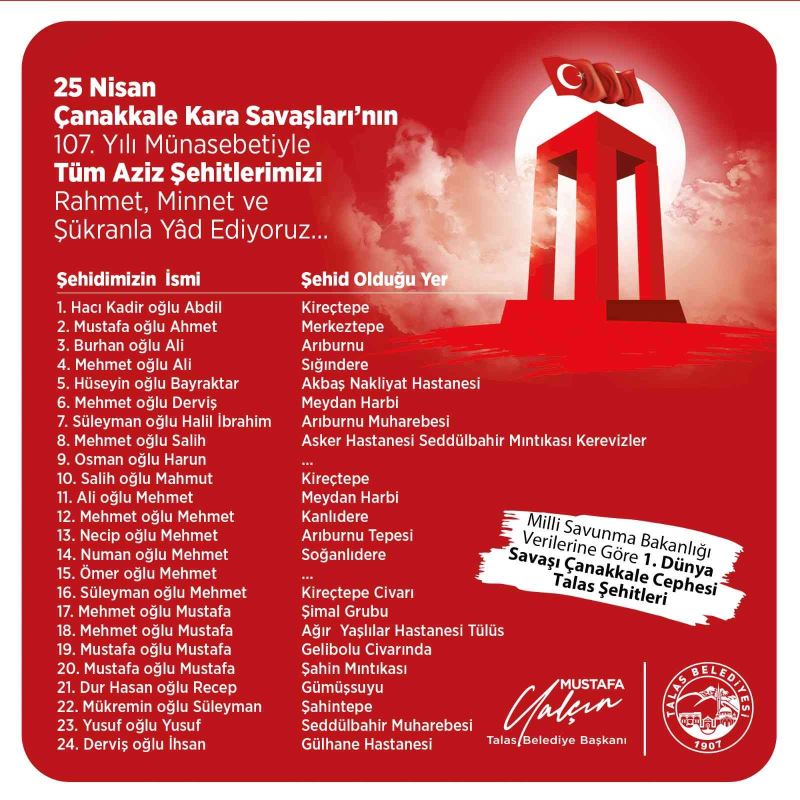 Sosyal medya hesabından yaptığı paylaşımda Talaslı şehitlerin isimlerini tek tek sıralayan Başkan Yalçın, “25 Nisan Çanakkale Kara Savaşlarının 107. Yıldönümü münasebetiyle tüm aziz şehitlerimizi rahmet, minnet ve şükranla yad ediyoruz" ifadelerini kullandı.