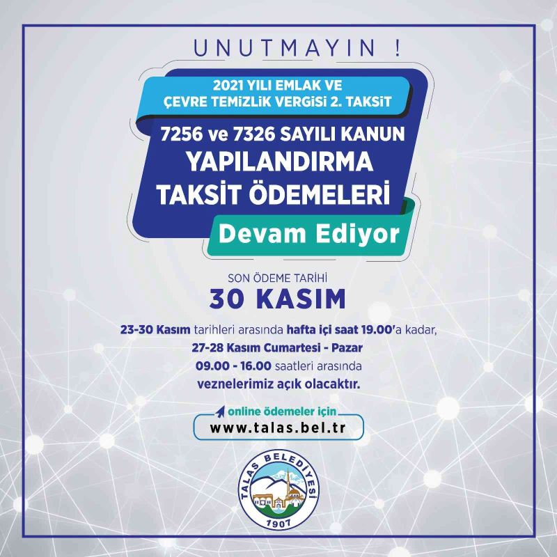 2021 yılı Emlak Çevre ve Temizlik vergisinin 2. taksit ödemesi ve 7256 ve 7326 sayılı kanun kapsamında gerçekleştirilen vergi yapılandırma ödemelerine ilişkin açıklama yapan Başkan Yalçın, işlemlerde yoğunluk oluşmaması ve vatandaşların zorluk yaşamaması için veznelerin mesai saatlerinin de yeniden ayarlandığını belirtti. 23-30 Kasım tarihleri arasında veznelerin kapanış saatinin hafta içi 19.00’a kadar uzatıldığını ifade eden Başkan Yalçın; “Hafta sonu da hizmet verecek vezneler Cumartesi ve Pazar günleri 09.00-16.00 saatleri arasında açık olacak. Ayrıca online ödeme sistemiyle de vatandaşlarımız www.talas.bel.tr adresinden ödemelerini gerçekleştirebilirler” dedi.