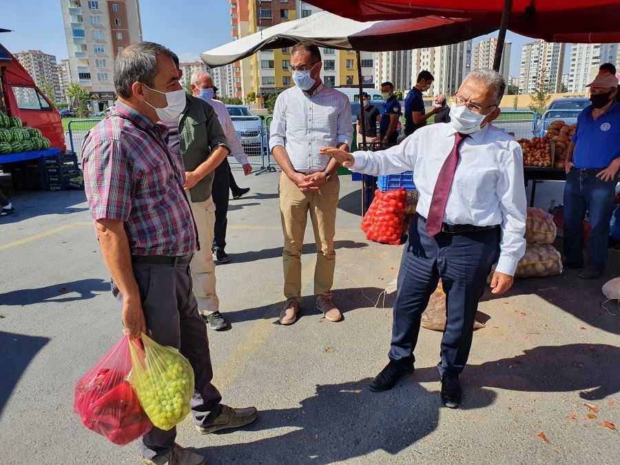 Kayseri Büyükşehir Belediye Başkanı Dr. Memduh Büyükkılıç, sık sık maske ve mesafe denetimi yaparak, koronavirüse karşı vatandaşları uyarıyor. Başkan Büyükkılıç salgın denetimlerine Yakut Semt Pazarı’nda devam etti.
