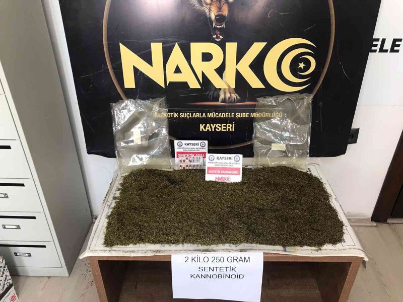 Edinilen bilgiye göre, Kayseri İl Emniyet Müdürlüğü Narkotik Suçlarla Mücadele Şube Müdürlüğü ekipleri, batı illerinden kente uyuşturucu madde getirebileceği bilgisi üzerine harekete geçti. 2 kişinin bulunduğu otobüsü durduran ekipler, arama yaptı. Yapılan aramada bebek bezleri içerisine zulalanmış 2 kilo 250 gram sentetik uyuşturucu ile 7 adet sentetik ecza hap ele geçirildi. Operasyonda otobüsteki 2 kişi ile farklı bir araçla yolu kontrol eden 3 kişi gözaltına alındı.