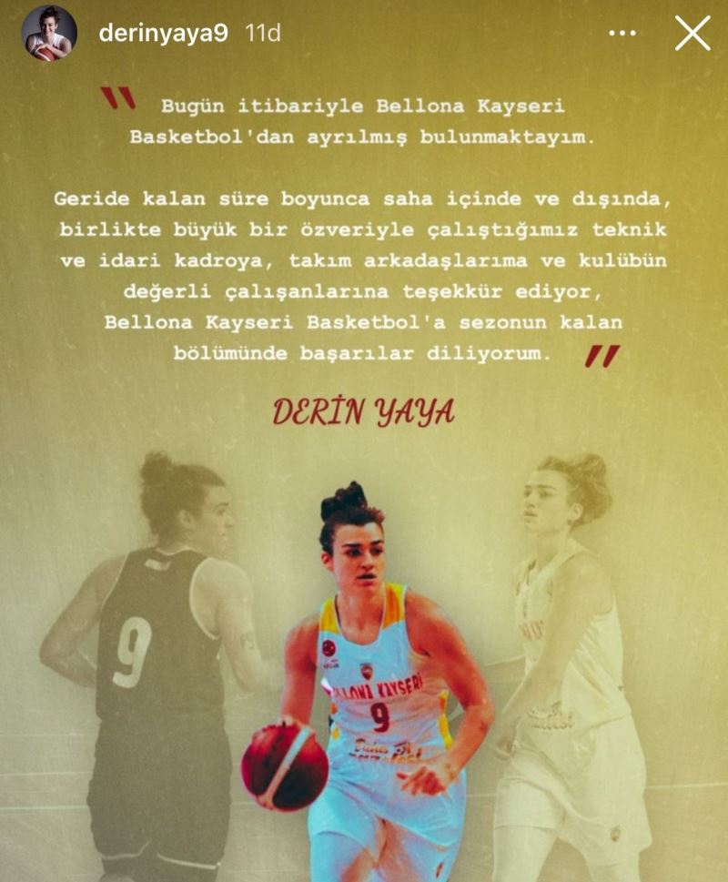 Derin Yaya sosyal medya hesabından yaptığı paylaşımda, “Bugün itibariyle Bellona Kayseri Basketbol’dan ayrılmış bulunmaktayım. Geride kalan süre boyunca saha içinde ve dışında birlikte büyük bir özveriyle çalıştığımız teknik ekip ve idari kadroya, takım arkadaşlarıma ve kulübün değerli çalışanlarına teşekkür ediyor, Bellona Kayseri Basketbola sezonun kalan bölümünde başarılar diliyorum” dedi.