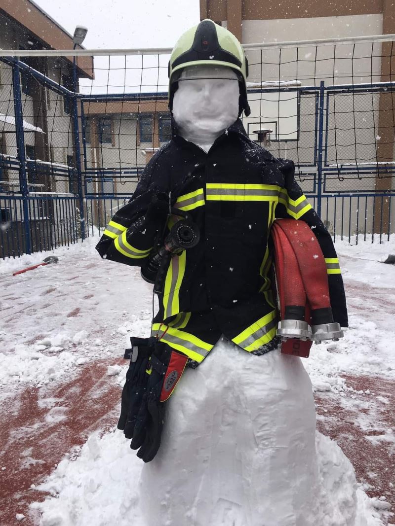 Kayseri’de itfaiye erleri tarafından yapılan kardan adama itfaiyeci kıyafeti giydirilerek ’kardan itfaiyeci’ ismi verildi.