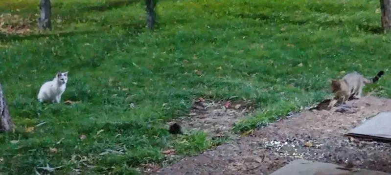 Kayseri’de bir parkta kaydedilen görüntüde bilinenin aksine fare kedileri kovaladı. ’Kedinin fare ile oynadığı gibi’ deyiminin tersine döndüğü görüntülerde iki kedinin ortasında kalan fare, kaçmak yerine üzerine gelen kedileri korkutarak kovalamaya çalışıyor. Kedilerin kendisini yemek için yaptığı hamlelere üzerlerine atlayarak cevap veren farenin görüntüleri izleyenleri gülümsetti.