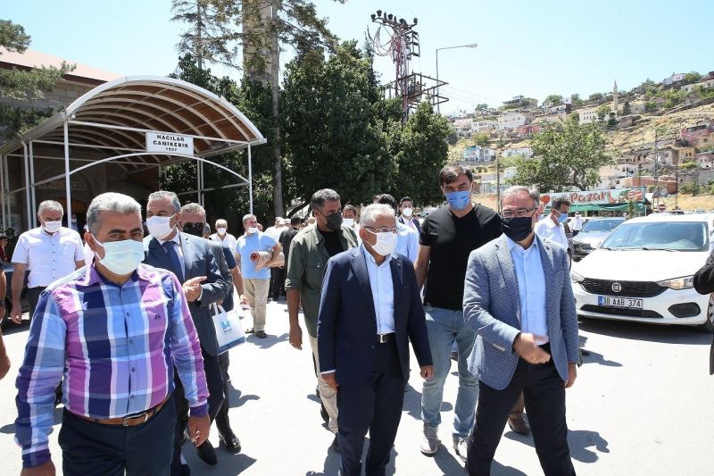 Bu hafta cuma namazını Hacılar ilçesi Camikebir’de kılan Başkan Büyükkılıç, namaz sonrası ilçe esnafları ve sakinleri ile görüşüp, bir süre sohbet etti. Büyükkılıç, esnaf ziyaretinin ardından Hacılar Belediye Başkanı Bilal Özdoğan ile birlikte 30 bin metrekarelik yaklaşık 5 milyon TL maliyeti olan 15 Temmuz Şehitler Meydan Parkı’ndaki çalışmaları yerinde inceledi. Büyükşehir Belediye Başkanı Dr. Memduh Büyükkılıç, burada yaptığı açıklamada, “Güzel şirin, butik, şehrimizin hemen yanı başında hayırseverleriyle, iş adamlarıyla meşhur ilçemizdeyiz. Geçmişten beri bizlere sahip çıkan, yerli ve milli değerlerimize, ay yıldızlı Türk bayrağımıza, vatanımıza, milletimize, devletimize sahip çıkan kardeşlerimize hizmetin en fazlasını yapsak az diyeceğimiz noktadayız. Uyum içerisinde bizimle çalışan başkanımıza, ilçe başkanımıza, meclis üyelerimize huzurlarınızda teşekkür ediyorum” dedi. İlçede yapılan ve yapımı devam eden projelerden bahseden Başkan Büyükkılıç, sözlerini şöyle sürdürdü;