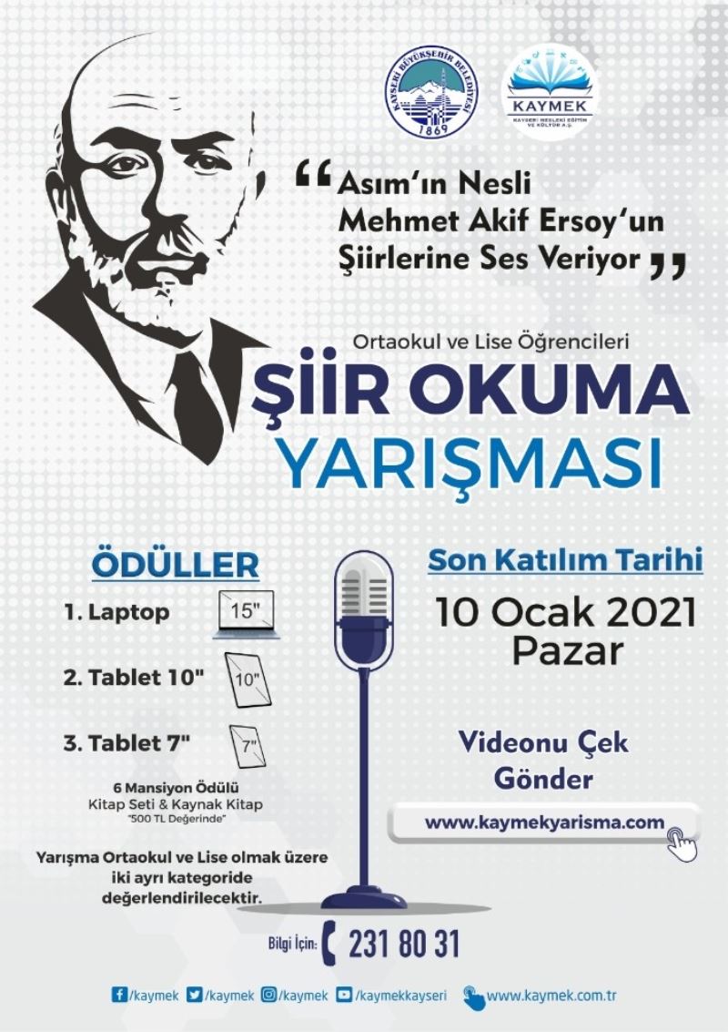 KAYSERİ BÜYÜKŞEHİR BELEDİYESİ KAYMEK A.Ş, MİLLİ ŞAİR MEHMET AKİF ERSOY’UN 27 ARALIK’TAKİ ÖLÜM YILDÖNÜMÜ MÜNASEBETİYLE “ASIM’IN NESLİ, AKİF’İN ŞİİRLERİNE SES VERİYOR” ADIYLA ŞİİR SESLENDİRME YARIŞMASI DÜZENLİYOR. BU KAPSAMDA KAYSERİ İL SINIRLARI İÇERİSİND