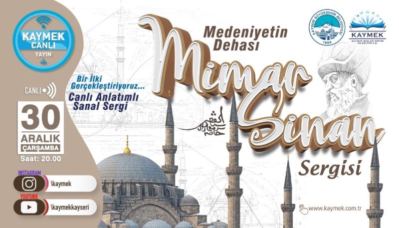 Kayseri Büyükşehir Belediyesi KAYMEK A.Ş, Pandemi süreci ile değişen ve dönüşen şartlara uygun olarak bir ilke daha imza atmaya hazırlanıyor. KAYMEK tarafından hazırlanan “Medeniyetin Dehası Mimar Sinan İsimli Canlı Anlatımlı Sanal Sergi” Çarşamba günü sanatseverlerin beğenisine sunulacak.
