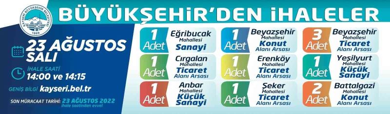 Mülkiyeti Kayseri Büyükşehir Belediyesi’ne ait olan Melikgazi ve Kocasinan’da 5 ticaret, 2 konut, 1 küçük sanayi arsası olmak üzere toplam 8 adet arsa Açık Teklif Usulü ihale ile ayrı ayrı satışa çıkarılırken, yine Melikgazi ve Kocasinan’da bulunan 1 ticaret, 1 sanayi, 1 küçük sanayi, 1 konut arsası olmak üzere toplam 4 adet arsa ise Kapalı Teklif Usulü ihale ile ayrı ayrı satışa sunuluyor. Satışa çıkarılan her iki ihalenin tarihi 23 Ağustos 2022 Salı günü olarak belirlenirken, Melikgazi ve Kocasinan’daki 8 adet arsa ihalesi saat 14.15’te, Melikgazi ve Kocasinan’da bulunan 4 adet arsanın ihalesi ise saat 14.00’te yapılacak.