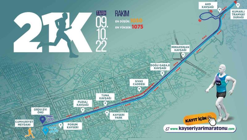 ‘Bir Maratondan Daha Fazlası’ sloganı ve dünya markası haline gelen ‘Erciyes’ temasıyla düzenlenecek Uluslararası Kayseri Yarı Maratonu 21K, 10K ve halk koşusu olmak üzere üç kategoride gerçekleştirilirken, halk koşusu ücretsiz olurken, 10K ve 21K parkurlarında 31 Ağustos 2022 tarihine kadar yapılacak kayıtlarda 125 TL katılım ücreti şartı bulunuyor.