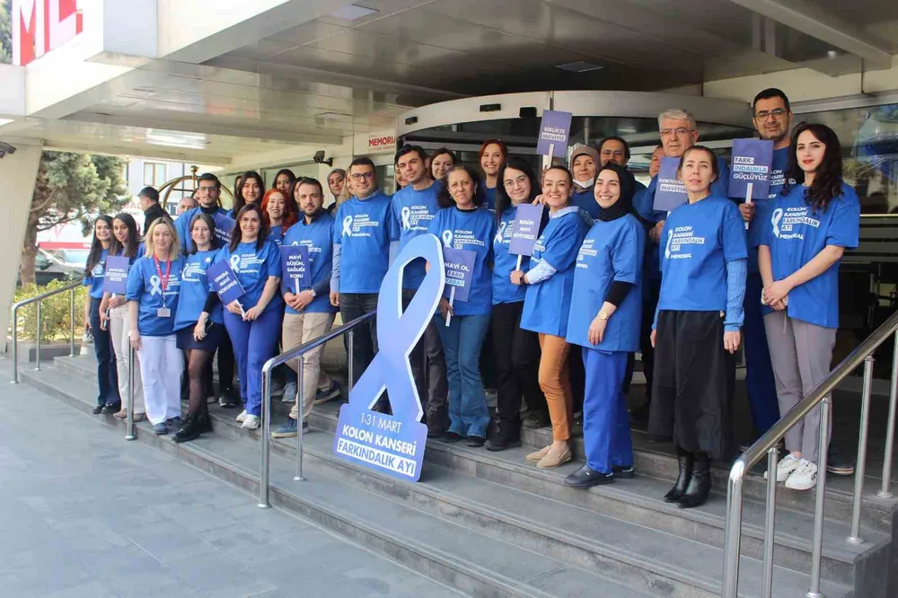 Memorial Kayseri Hastanesi’nde 1-31 Mart Kolon Kanseri Farkındalık Ayı dolayısıyla sağlık çalışanları hastalığa dikkat çekmek amacıyla mavi tişört giydi.