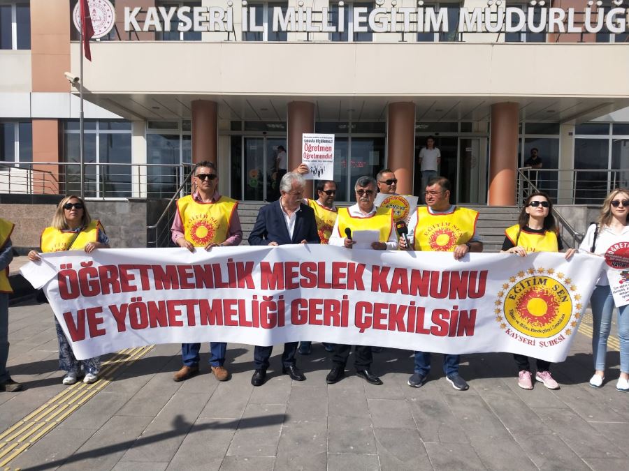 Eğitim Sen Kayseri Şube Başkanı Sedat Ünsal, öğretmenlik meslek kanunu ve yönetmeliğinin geri çekilmesini istedi. Ünsal, “Eğitim Sen olarak Öğretmenlik Meslek Kanunu ve yönetmeliğine karşı gerek hukuksal, gerekse örgütsel mücadelemizi sonuna kadar sürdürecegiz” dedi.
