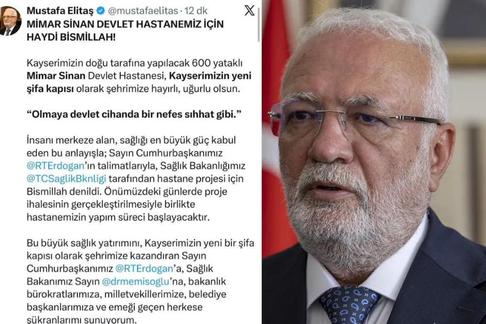 AK Parti Genel Başkan Vekili Mustafa Elitaş, "Mimar Sinan Devlet Hastanemiz için haydi Bismillah!" diyerek sürecin başladığını duyurdu. Cumhurbaşkanı Recep Tayyip Erdoğan’ın talimatlarıyla projenin hız kazandığını belirten Elitaş "Kayserimizin doğu tarafına yapılacak 600 yataklı Mimar Sinan Devlet Hastanesi, Kayserimizin yeni şifa kapısı olarak şehrimize hayırlı, uğurlu olsun dedi. Elitaş, şunları kaydetti. ‘Olmaya devlet cihanda bir nefes sıhhat gibi.’ İnsanı merkeze alan, sağlığı en büyük güç kabul eden bu anlayışla; Sayın Cumhurbaşkanımız Recep Tayyip Erdoğan'ın talimatlarıyla, Sağlık Bakanlığımız tarafından hastane projesi için Bismillah denildi. Önümüzdeki günlerde proje ihalesinin gerçekleştirilmesiyle birlikte hastanemizin yapım süreci başlayacaktır. Bu büyük sağlık yatırımını, Kayserimizin yeni bir şifa kapısı olarak şehrimize kazandıran Sayın Cumhurbaşkanımız Recep Tayyip Erdoğan’a, Sağlık Bakanımız Sayın Kemal Memişoğlu'na Cumhurbaşkanlığı Strateji ve Bütçe Başkanımız İbrahim Şenel'e, bakanlık bürokratlarımıza, milletvekillerimize, belediye başkanlarımıza ve emeği geçen herkese şükranlarımı sunuyorum." ifadelerine yer verdi. Kayseri Büyükşehir Belediye Başkanı Dr. Memduh Büyükkılıç ise yatırımın stratejik önemine dikkat çekerek şu ifadeleri kullandı: "Kayseri’mizin doğusunda yükselecek 600 yataklı Mimar Sinan Devlet Hastanesi, hemşehrilerimiz için son derece kıymetli bir sağlık yatırımı.
