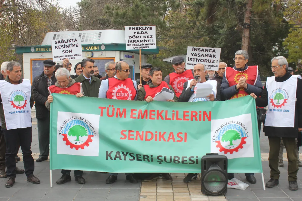 Cumhuriyet Meydanında bir araya gelen sendika üyeleri burada bir basın açıklaması yaparak tüm emeklileri 10 Aralık’ta Ankara’da düzenlenecek olan büyük emekli mitinge davet etti. Burada açıklamayı 2017 Tüm Emekliler Sendikası Kayseri Şube Başkanı Ali Gül yaptı. Gül, Emeklilikte ayrımcılığa, eşitsizliğe ve adaletsizliğe son verilmesini istedi. Gül, şunları ifade etti.”Emeklilikte insan onuruna yarışın bir ücret için, emekli aylıklarının prim günü esas alınarak intibak yasası çıkarılarak yeniden düzenlenmesi için, 3600 ek gösterge mağdurlarının haklarının verilmesi için, en düşük emekli aylığının asgari ücret kadar olması için, sağlıkta katkı paylarının tamamen kaldırılması için, asgari ücretten az olmamak şartıyla emekli Bayram ikramiyelerinin miktar ve sayısının arttırılması için, sendika hakkımızın engellemesine son verilmesi sendika kapatma davalarının geri çekilmesi için, emeklilikte yaş şartının Adil şekilde kademeli olarak düzenlenmesi için saydığımız tüm taleplerimiz için Bizler emekli sendikaları olarak 10 Aralık saat 13.00’te Ankara Anıt Park’ta yapacağımız toplu sözleşmeli sendika hakkı mitingimize tüm halkımızı davet ediyoruz.Emeklilerin tüm yaşamsal hakları için sizleri de dayanışmaya çağırıyoruz Biz emekli sen emekliler dayanışma Sendikası tüm emekliler Sendikası olarak Emeklilerin birlikte mücadelesini sonuna kadar sürdüreceğiz.” Haber: Mehmet Yılmaz