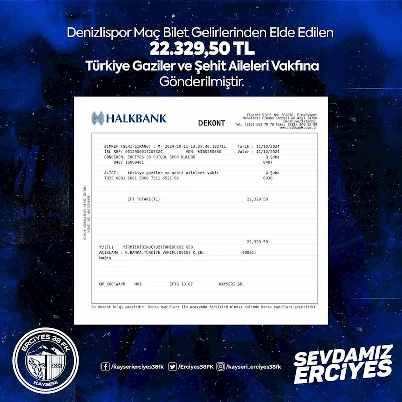 Türkiye 3. Lig 4. Grupta bulunan Erciyes 38 Futbol Kulübü, iki hafta önce sahasında oynadığı Denizlispor maçının gelirini Şehit Aileleri Derneği’ne bağışladı. Kulüp sosyal medya hesaplarından yapılan açıklamada; Erciyes 38 Futbol Kulübü’nden Türkiye Gaziler ve Şehit Aileleri Vakfı hesabına 29 bin 329 Türk Lirası 50 kuruş gönderildiği bildirildi.