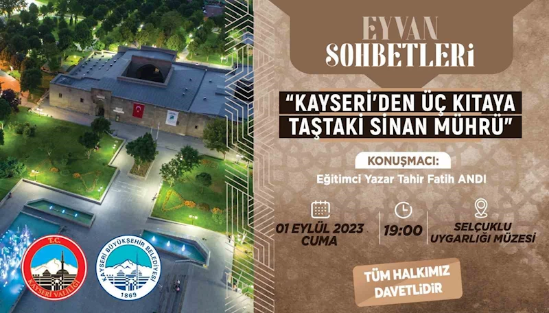 Kayseri’nin değerlerini, sahip olduğu özelliklerini, kültür ve tarihini konu alan Eyvan Sohbetleri programı, kadim kentin önemli değerlerini tanıtmaya ve farklı, çarpıcı yönler ile anlatmaya devam ediyor. Bu istikamette Kayseri’den dünyaya açılarak döneme ve dünyaya mimari konusunda damga vuran, ‘Koca Sinan’ olarak da bilinen Mimar Sinan’ı konu alan Eyvan Sohbetleri, Kayserililerle buluşacak. Eyvan Sohbetleri’nde bu kez katılımcılarına Mimar Sinan’ı anlatacak olan konuşmacı Eğitimci Yazar Tahir Fatih Andı, ’Kayseri’den Üç Kıtaya Taştaki Sinan Mührü’ başlıklı konu ile ünlü mimarın hayatına ve eserlerine dair bilgiler paylaşacak.