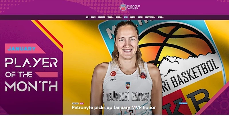 EuroCup Women mücadelesinde çeyrek finale yükselen Melikgazi Kayseri Basketbol’un başarılı oyuncusu Gintare Petronyte, Eurocup Ayın Kadın Oyuncusu seçildi. EuroCup’un resmi internet sitesinden duyurulan haberde özellikle Gintare Petronyte’nin Macar ekibi Pecs ile oynanan iki maçta ortaya koyduğu başarılı performansa atıf yapıldı. Tanıtım yazısı ile duyurulan ayın oyuncusu konusunda yapılan paylaşımda, “Gintare Petronyte, bir ay boyunca destansı bir mücadele sonunda Melikgazi Kayseri’yi EuroCup Kadınlar Çeyrek Finallerine göndermenin karşılığı alındı” ifadelerine yer verildi.