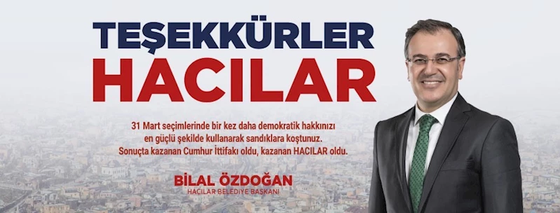 31 Mart Mahalli İdareler Seçimleri’nde Kayseri’nin Hacılar ilçesinde kesin olmayan sonuçlara göre oyların yüzde 39,04’ünü alan Cumhur İttifakı Adayı Bilal Özdoğan başkanlığa seçildi.