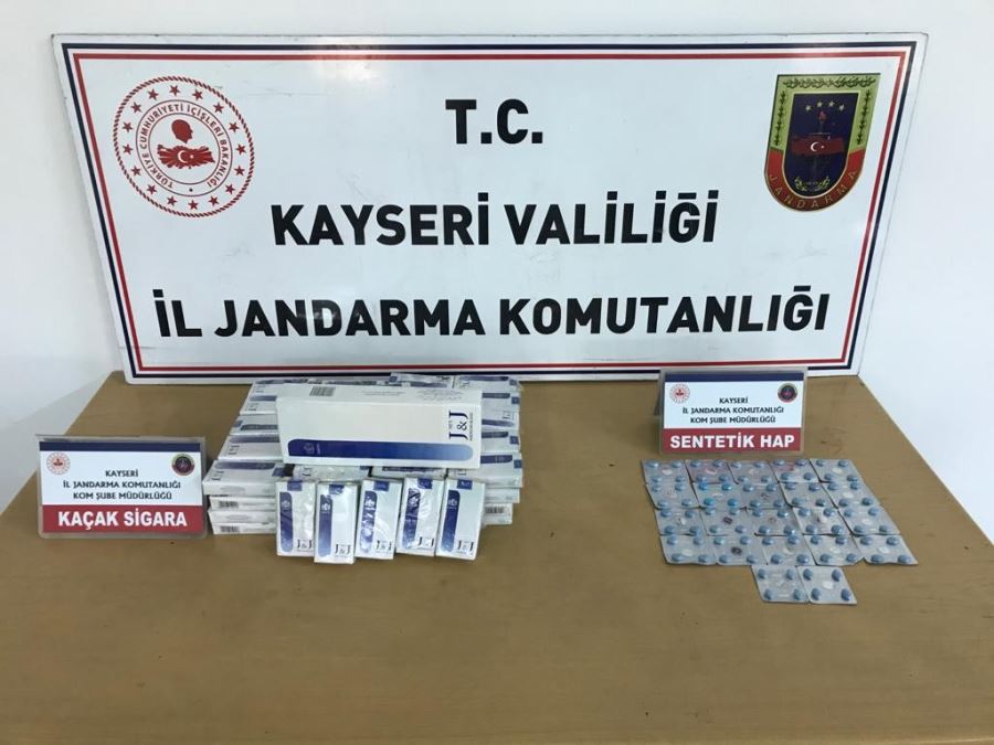 Kayseri İl Jandarma Komutanlığı ekiplerince yapılan çalışmalarda 88 adet psikotrop sentetik hap ve 96 paket kaçak sigara ele geçirildi.