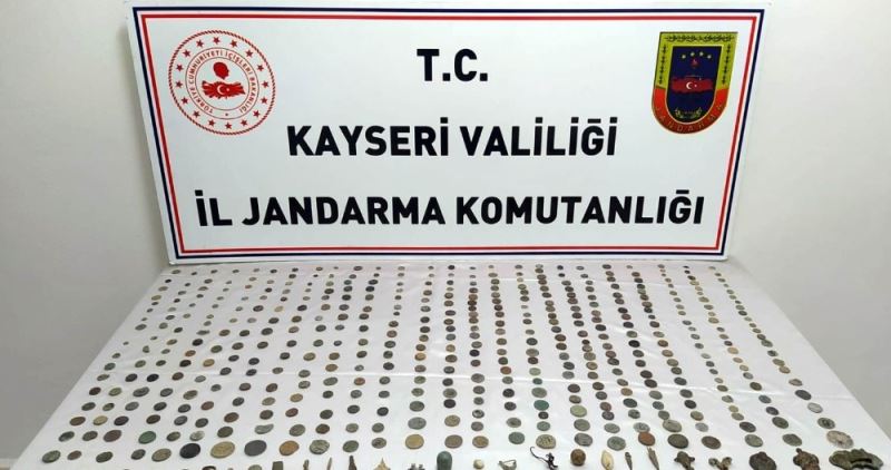 Kayseri İl Jandarma Komutanlığı ekiplerince yapılan çalışmalarda Roma ve Bizans dönemlerine ait olduğu değerlendirilen sikke, obje yüzük ve mühür ele geçirildi.
