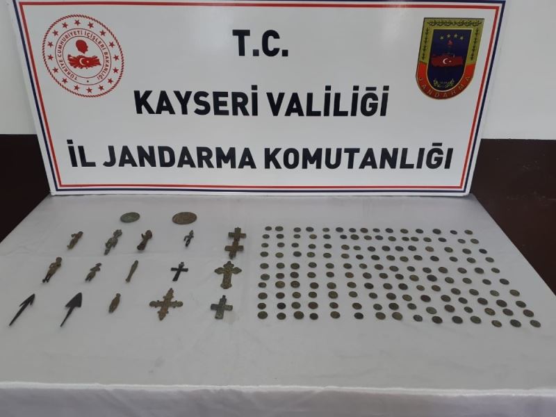 Kayseri İl Jandarma Komutanlığı ekiplerince yapılan çalışmalarda Roma ve Bizans Dönemi’ne ait 153 sikke ve 15 adet tarihi obje ele geçirildi. Olayla ilgili 5 kişi gözaltına alındı.