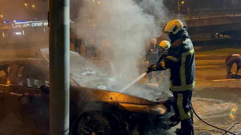 Kaldırıma çarpan otomobil alev aldı, sürücü olay yerinden kaçtı