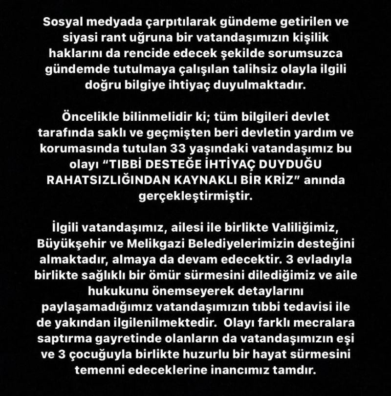 Kayseri Büyükşehir Belediyesi tarafından kendine zarar veren şahısla ilgili yapılan açıklamada, "33 yaşındaki vatandaşımız bu olayı tıbbi desteğe ihtiyaç duyduğu rahatsızlığından kaynaklı bir kriz anında gerçekleştirmiştir. İlgili vatandaşımız, ailesi ile birlikte Valiliğimiz, Büyükşehir ve Melikgazi Belediyelerimizin desteğini almaktadır, almaya da devam edecektir" denildi.