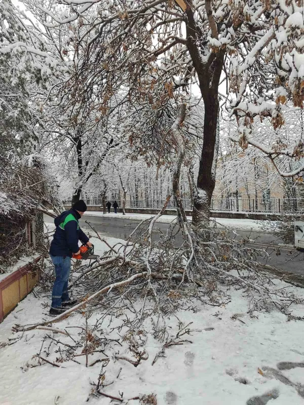 Büyükşehir Belediyesi, olumsuz hava şartlarının şehir yaşamını aksatmaması ve vatandaşların güvenliğinin sağlanması amacıyla saha çalışmalarını aralıksız sürdürüyor. Kar küreme ve tuzlama faaliyetlerini titizlikle yürüten Büyükşehir Belediyesi, kar yağışı nedeniyle zarar gören ağaç ve ağaç dallarına yönelik de kapsamlı bir güvenlik çalışması gerçekleştiriyor.