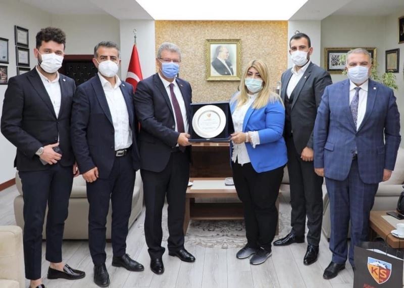 Hes Kablo Kayserispor Başkanı Berna Gözbaşı, Hüseyin Akay’a teşekkür ederek ziyaretin anısına plaket taktim etti.