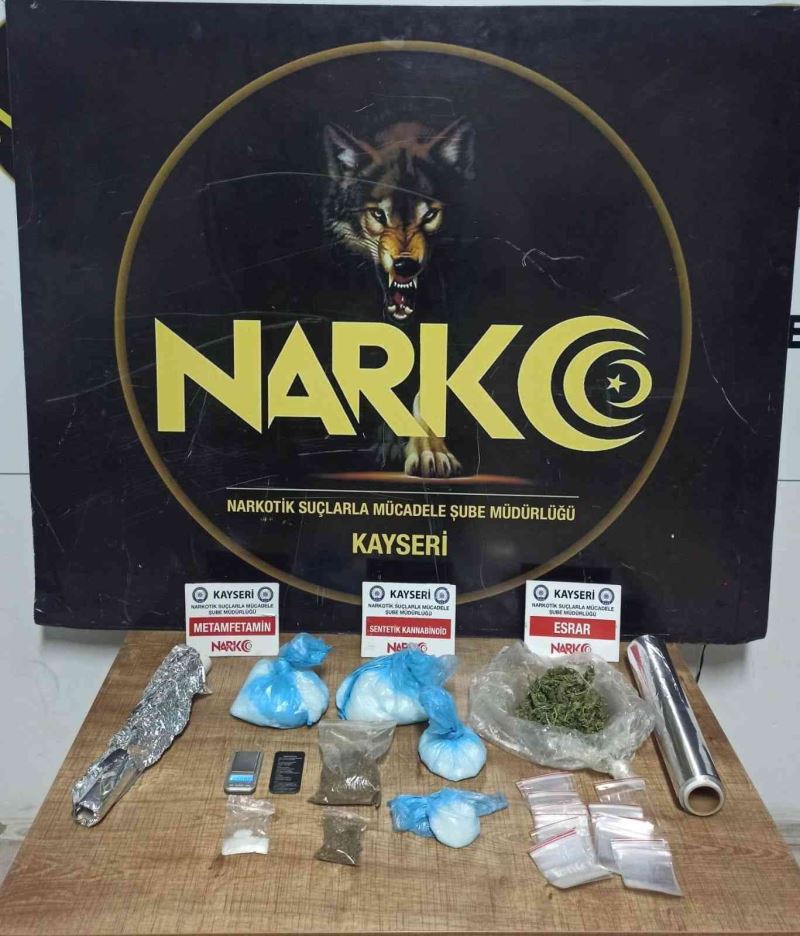 Kayseri’de polis ekipleri tarafından 3 farklı adrese eş zamanlı düzenlenen operasyonda 2 kişi gözaltına alındı, çeşitli miktarlarda uyuşturucu ele geçirildi.