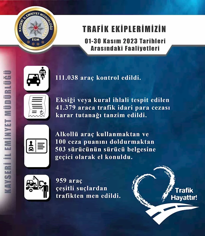 Kayseri l Emniyet Müdürlüğü Trafik Ekipleri tarafından 01-30 Kasım tarihleri arasında yapılan çalışmalarda 111 bin 38 araç kontrol edildi. Çalışmalarda eksiği veya kural ihlali tespit edilen 41 bin 379 araca trafik idari para cezası karar tutanağı tanzim edildi.