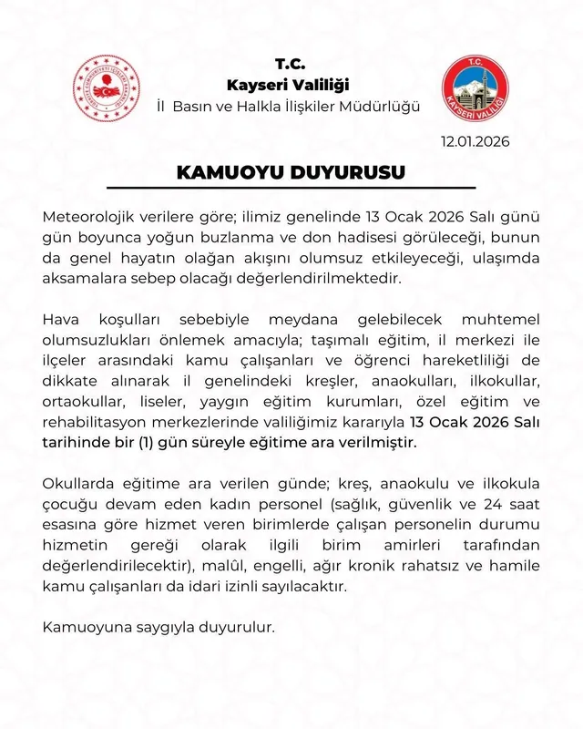 "Hava koşulları sebebiyle meydana gelebilecek olumsuzları önlemek amacıyla taşımalı eğitim, il merkezi ile ilçeler arasındaki kamu çalışanları ve öğrenci hareketliliği de dikkate alınarak il genelindeki kreşler, anaokulları, ilkokullar, ortaokullar, liseler, yaygın eğitim, özel eğitim ve rehabilitasyon merkezlerinde valiliğimiz kararıyla 13 Ocak Salı günü eğitime 1 gün süreyle ara verilmiştir."