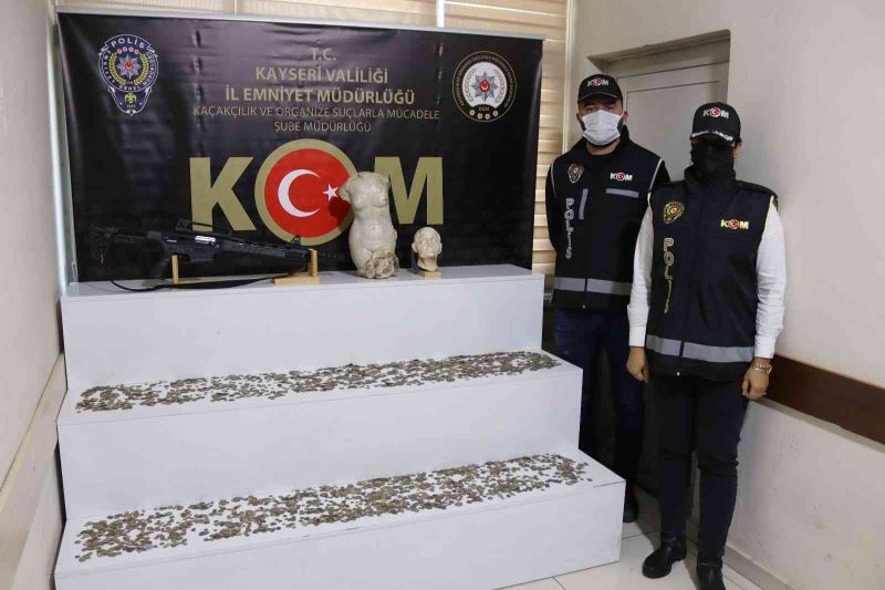 Edinilen bilgiye göre, Kayseri İl Emniyet Müdürlüğü Kaçakçılık ve Organize Suçlarla Mücadele Şube Müdürlüğü ekipleri, bir ihbar üzerine Kocasinan ilçesine bağlı Argıncık Mahallesinde 2 müstakil eve operasyon düzenledi. Operasyonda Ö.D. ve Z.E.T. gözaltına alınırken, yapılan aramalarda ise piyasa değeri 5 milyon TL olan Bizans ve Roma dönemine ait 5 milyon 100 adet sikke, 2 farklı heykel ve 1 tüfek ele geçirildi. Şahısların tarihi eserleri yurt dışına çıkaracağı öğrenilirken, ele geçirilen malzemelerin müzeye teslim edileceği bildirildi.