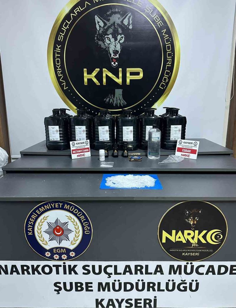 Kayseri İl Emniyet Müdürlüğü Narkotik Suçlarla Mücadele Şube Müdürlüğü ekiplerince yapılan çalışmalarda ’uyuşturucu ticareti’ yapmak suçundan 2 kişi gözaltına alınırken ele geçirilen uyuşturucu madde ve etil alkole el konuldu.