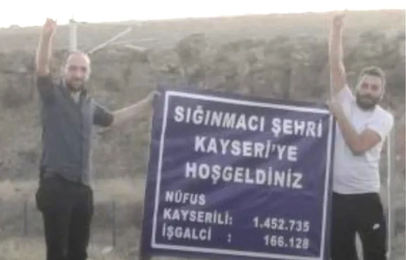 Ülkücü işareti yaparak Kayseri’deki mülteci sayısına dikkat çeken iki genç, yetkililere açtıkları pankartla mesaj verdi.