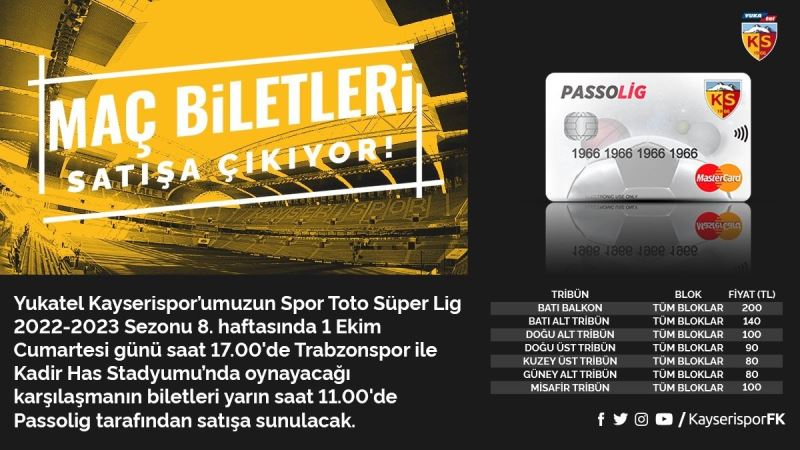 SÜPER LİG'İN 8. HAFTASINDA RHG ENERTÜRK ENERJİ STADYUMU’NDA OYNANACAK OLAN YUKATEL KAYSERİSPOR-TRABZONSPOR MAÇININ BİLET FİYATLARI BELLİ OLDU.SÜPER LİG'İN 8. HAFTASINDA RHG ENERTÜRK ENERJİ STADYUMU’NDA OYNANACAK OLAN YUKATEL KAYSERİSPOR-TRABZONSPOR MAÇIN
