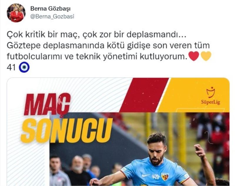 Süper Lig’in 32. haftasında deplasmanda Göztepe ile karşılaşan ve müsabakayı 2-1 kazanan Kayserispor’da yüzler gülüyor. 5 hafta sonra kazanmanın mutluluğunu yaşayan sarı kırmızılı takımda Kulüp Başkanı Berna Gözbaşı, futbolcuları ve teknik heyeti kutladı. Maç sonrasında sosyal paylaşım sitesindeki hesabından bir paylaşım yapan Berna Gözbaşı, "Çok kritik bir maç, çok zor bir deplasmandı. Göztepe deplasmanında kötü gidişe son veren tüm futbolcularımı ve teknik yönetimi kutluyorum" cümleleri kurdu.