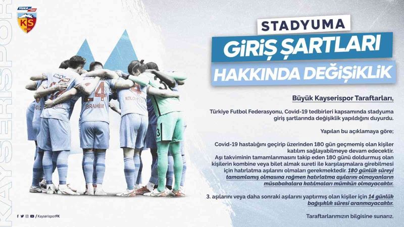 Süper Lig takımlarından Yukatel Kayserispor Kulübü, yazılı bir açıklama yaparak sarı kırmızılı taraftarı Covid19 aşısı olmaları konusunda uyardı. Kulüpten yapılan açıklamada; "Türkiye Futbol Federasyonu, Covid-19 tedbirleri kapsamında stadyuma giriş şartlarında değişiklik yapıldığını duyurdu. Yapılan bu açıklamaya göre; Covid-19 hastalığını geçirip üzerinden 180 gün geçmemiş olan kişiler katılım sağlayabilmeye devam edecektir. Aşı takviminin tamamlanmasını takip eden 180 günü doldurmuş olan kişilerin kombine veya bilet almak sureti ile karşılaşmalara girebilmesi için hatırlatma aşılarını olmaları gerekmektedir. 180 günlük süreyi tamamlamış olmasına rağmen hatırlatma aşılarını olmayanların müsabakalara katılmaları mümkün olmayacaktır. 3. aşılarını veya daha sonraki aşılarını yaptırmış olan kişiler için 14 günlük bağışıklık süresi aranmayacaktır. Taraftarlarımızın bilgisine sunarız" denildi.