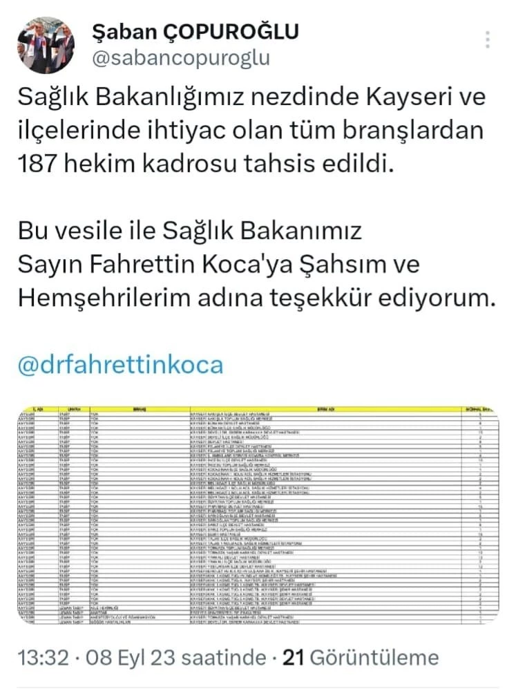 AK Parti Kayseri Milletvekili Şaban Çopuroğlu, sosyal medya hesabından yaptığı paylaşımda, Kayseri’de ihtiyaç olan branşlarda 187 hekim kadrosu tahsis edildiğini duyurdu.